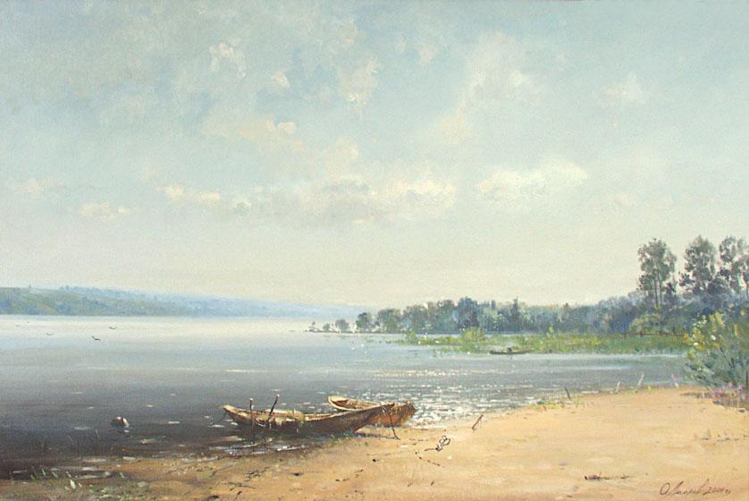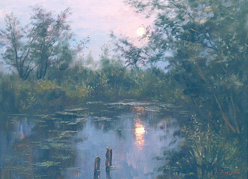 Кладите короткими горизонтальными мазками краску разных оттенков, не рисуйте большие участки воды одним цветом, тогда вода завибрирует, как и положено жидкости.